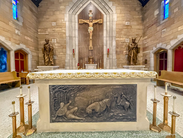 Ring’s rendering of the conversion of Saint Paul at the base of the altar contains many elements that are “new.” It is the first piece of bronze art to be included in the church, and it is a unique rendering of St. Paul’s conversion. Other elements are “old.” The altar is made of limestone, which retains a long tradition of having a limestone altar in this specific church, and the emphasis on Paul’s horse continues a tradition of artistic reflection on this part of his conversion.